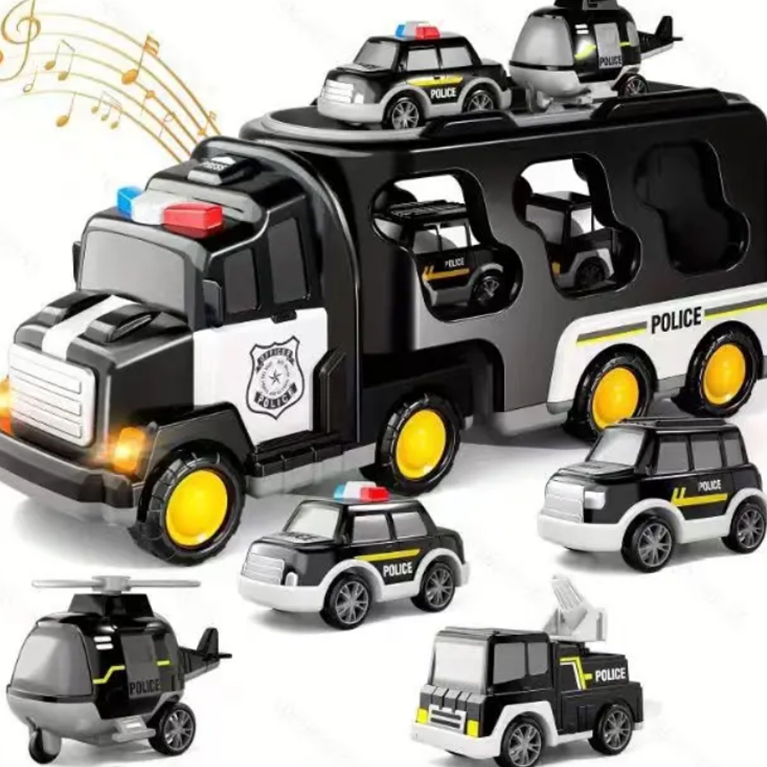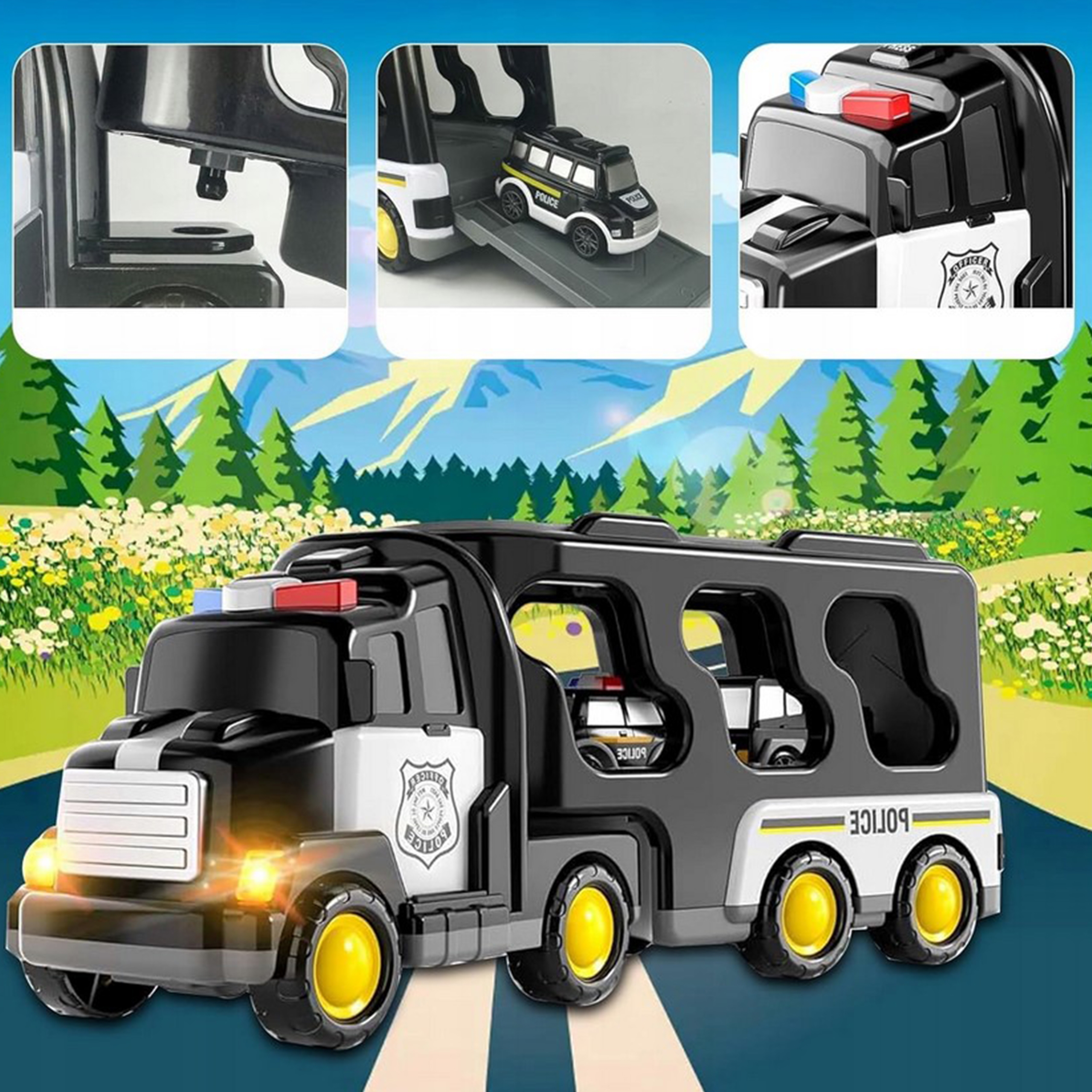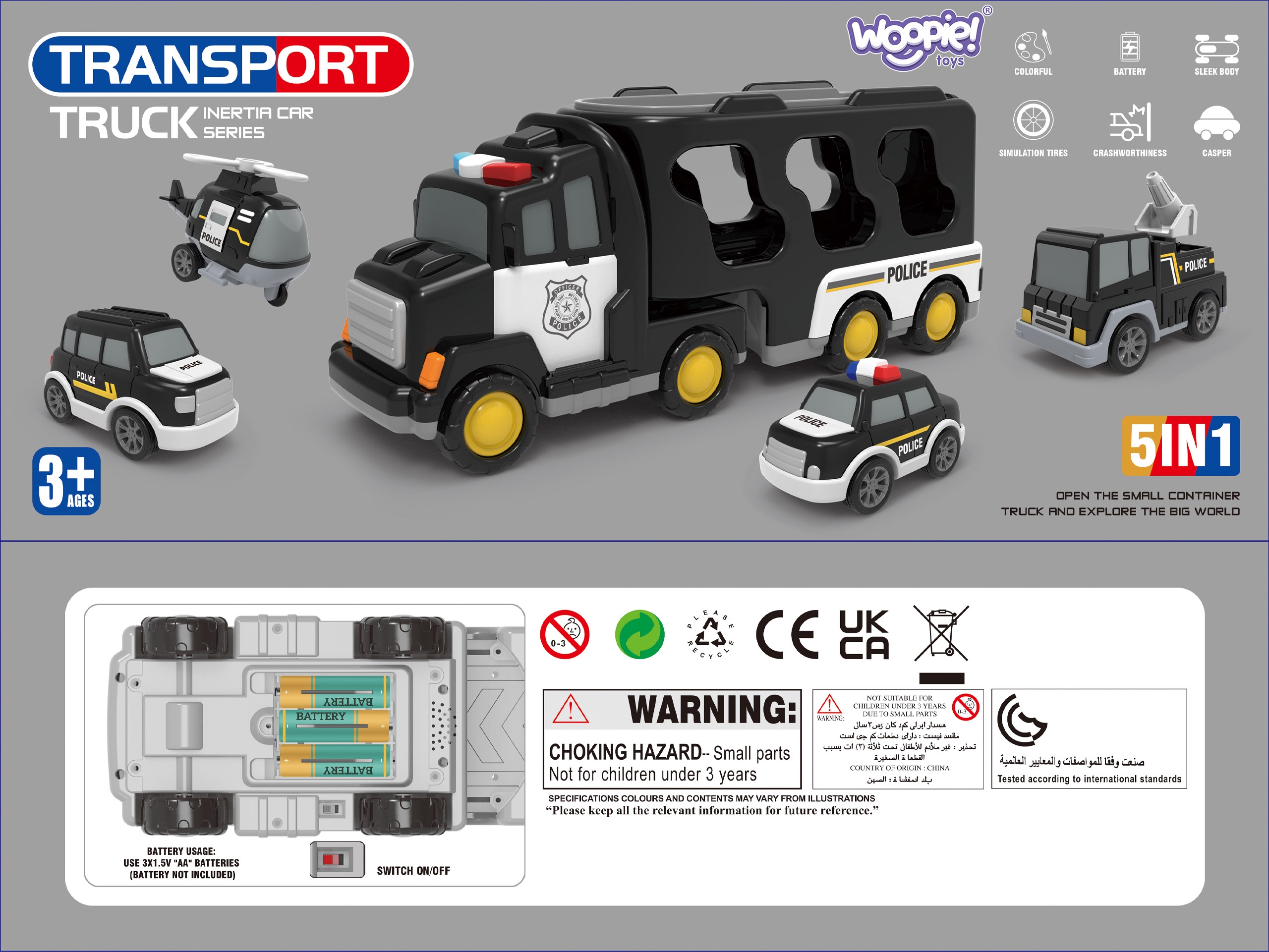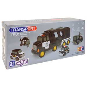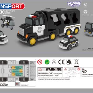 Suur politseiveok + 4 autot kaubamärgilt Woopie See väikestele politseihuvilistele mõeldud viis-ühes mänguasi on ideaalne komplekt igale väikesele päästjale! Vajutage veoki kabiini ülaosas olevat nuppu, et näha eredaid vilkuvaid tulesid ja kuulda realistlikke sireene, mis on lastele väga atraktiivsed. Komplektis on suur transpordiauto ja neli politseiautot: soomusauto, veekahuriga veoauto, helikopter, politseiauto. Igal sõidukil on liikuvad elemendid, mis panevad teie lapse päästeoperatsioonide ajal end tõelise kangelasena tundma! Komplekt on suurepärane idee sünnipäevaks, jõuludeks või muuks sündmuseks. Omadused: – Mänguasi vanusele alates 3. eluaastast – 5 autost koosnev komplekt (XXL puksiirauto ja 4 minisõidukit) – Interaktiivne mänguasi – helid ja tuled – Mänguasi töötab 3 “AA” patareiga (ei sisaldu komplektis) – Mänguasi sobib ideaalselt nii õues kui ka siseruumides mängimiseks. Väikeste laste mänguautodega manipuleerimine, ekskavaatori pööramine või betoonisegisti liigutamine aitavad arendada täpseid käteliigutusi. Kujutlusvõime: need mänguasjad võimaldavad lastel ette kujutada, mis tunne on olla veoautojuht, ekskavaatori operaator või ehitustööline. Suhtlemine ja koostöö: kui lapsed koos mängivad, peavad nad läbi saama, koos planeerima ja tegutsema, mis arendab sotsiaalseid oskusi. Mehhanismi mõistmine: Lapsed saavad jälgida, kuidas selliste sõidukite liikuvad osad töötavad, mis võib ärgitada nende tehnilist uudishimu. Komplekti kuulub: Transpordihaagis. Soomustatud auto. Veekahuri veoauto. Helikopteri politseiauto.