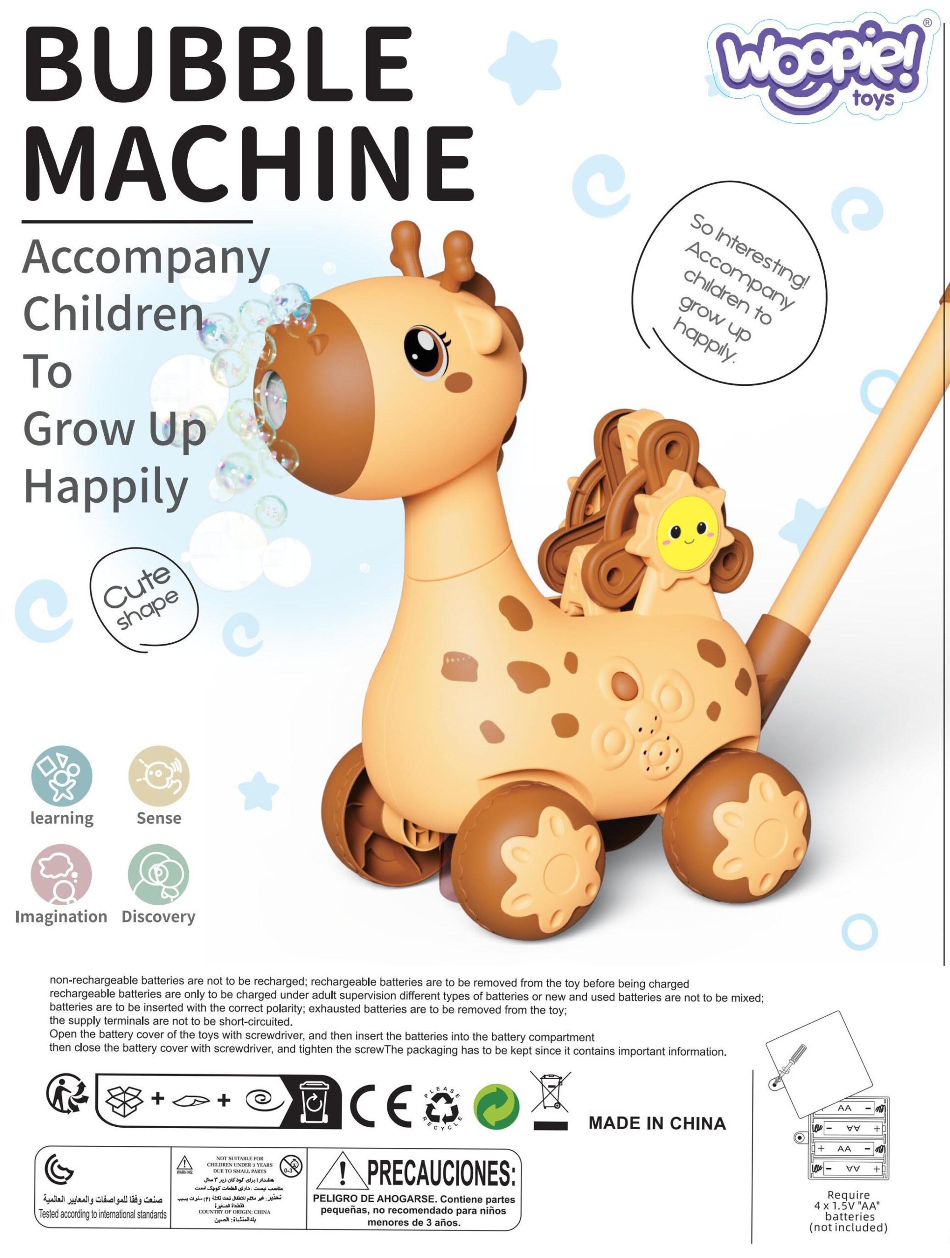WOOPIE kaubamärgi kaelkirjakukujuline mullimasin on suurepärane mänguasi lastele. Mullide puhumise ajal mängib kaelkirjak mõnusat meloodiat, mis muudab aja veelgi mõnusamaks. Vabanenud mullid ei tulistata mitte ainult kõrgel sagedusel, vaid täiendavalt paigaldatud ventilaator puhub neid veelgi kaugemale. Olemas on ka vedeliku anum mullide jaoks ja pulk, tänu millele saame hirve lihtsalt 4 rattal juhtida. Mänguasi sobib suurepäraselt õues või kodus mängimiseks ning sellel on palju kinnitatavaid elemente. Omadused Mänguasi vanusele alates 3. eluaastast Mängib meloodiat, puhub palju mulle ja saadab need ventilaatori abil kaugele. Valgusefekt – mänguasjal on mullide puhumisel vilkuvad tuled. Sellel on sisse- ja väljalülitusnupp mänguasja automaatseks sisse- ja väljalülitamiseks. Komplektis on anum vedeliku jaoks ja kinnitatud pulk mänguasja juhtimiseks. Rool, millega saab keerata 4 ratast, mis muudavad mänguasja juhtimise väga meeldivaks ja lihtsaks. Nõuded: “AA” patarei. 3x 1,5 V (ei kuulu komplekti) Kaasas: Kinnitatavad elemendid tähe või kaelkirjaku kõrvade kujul Kokkupandav pulk mänguasja juhtimiseks