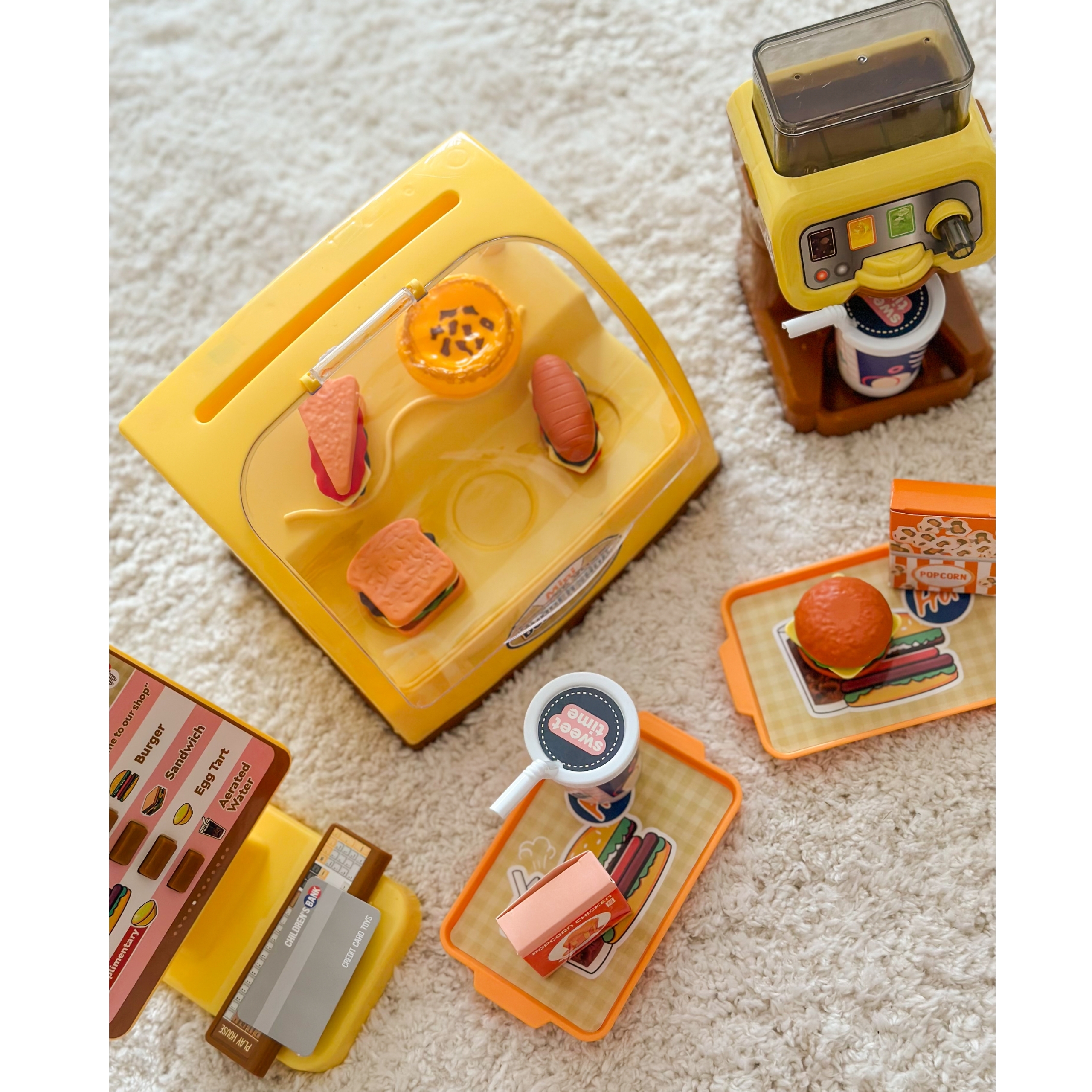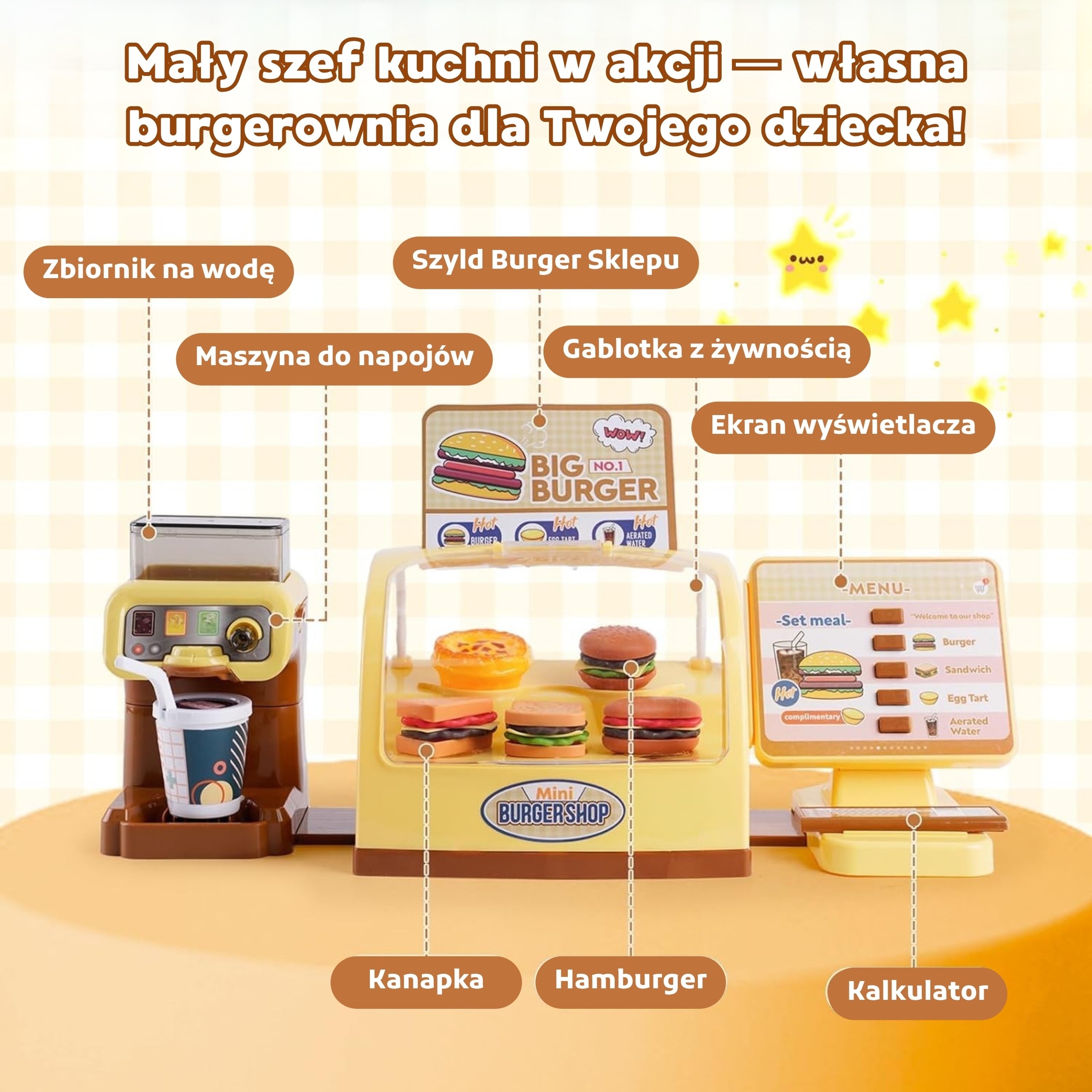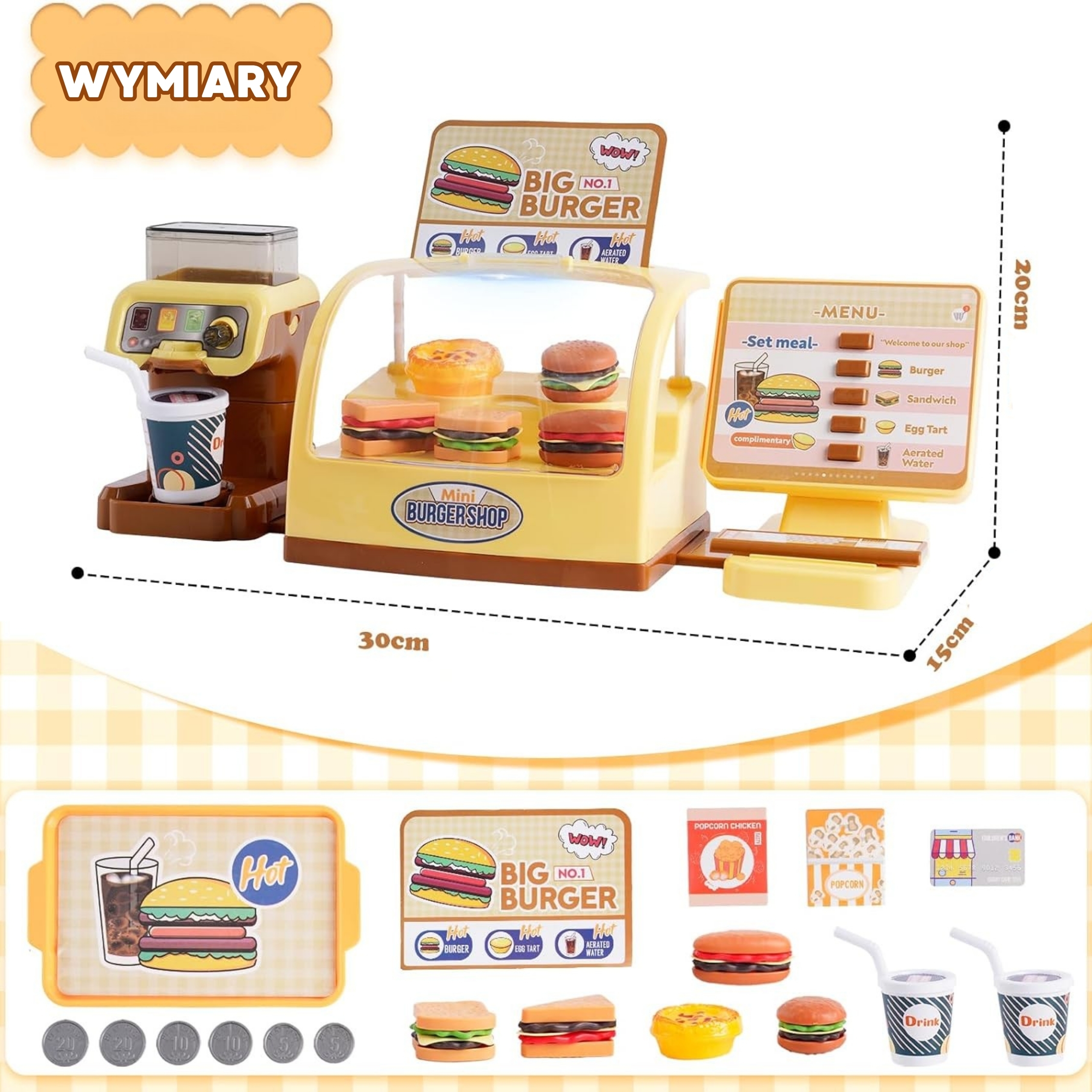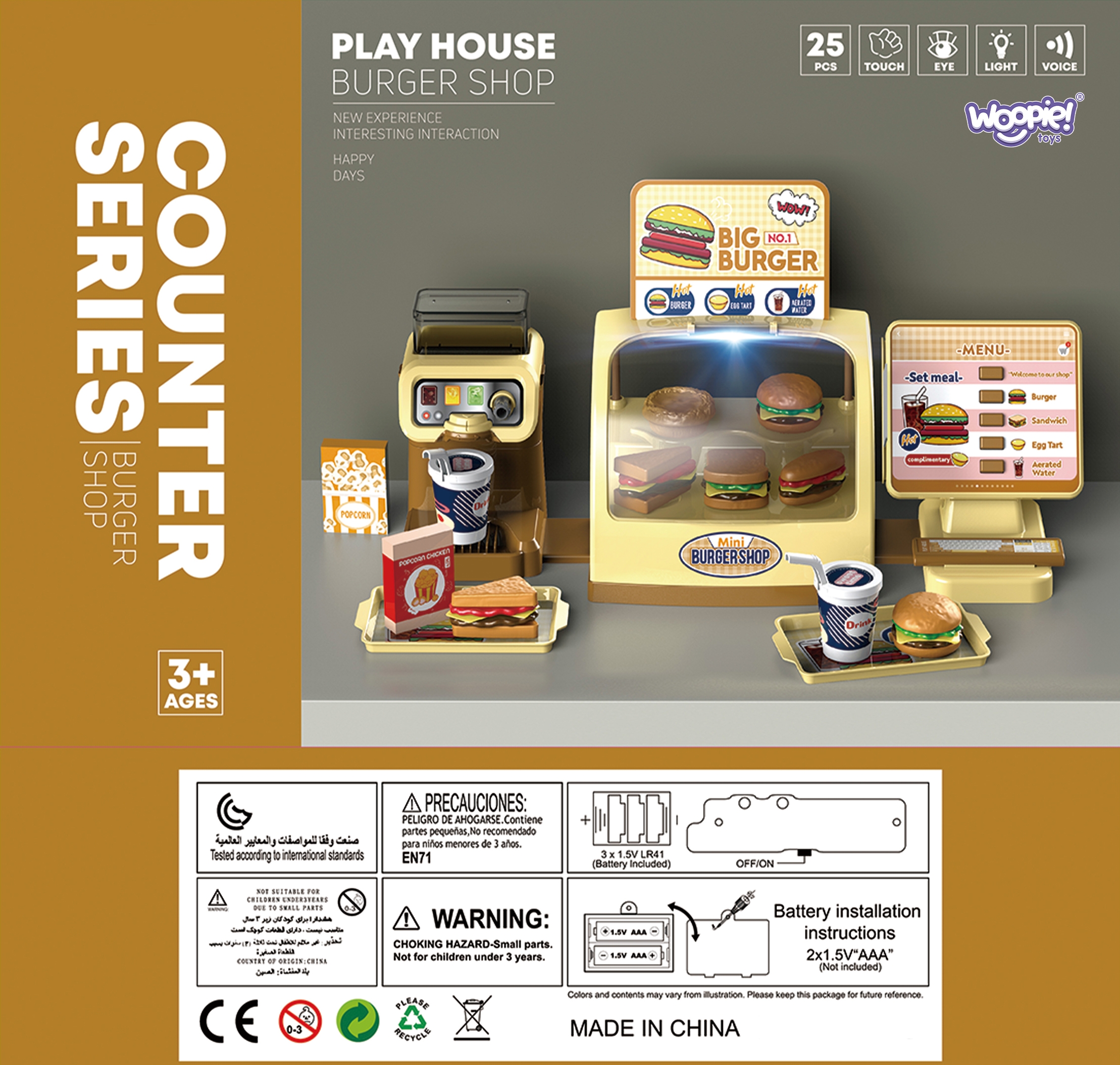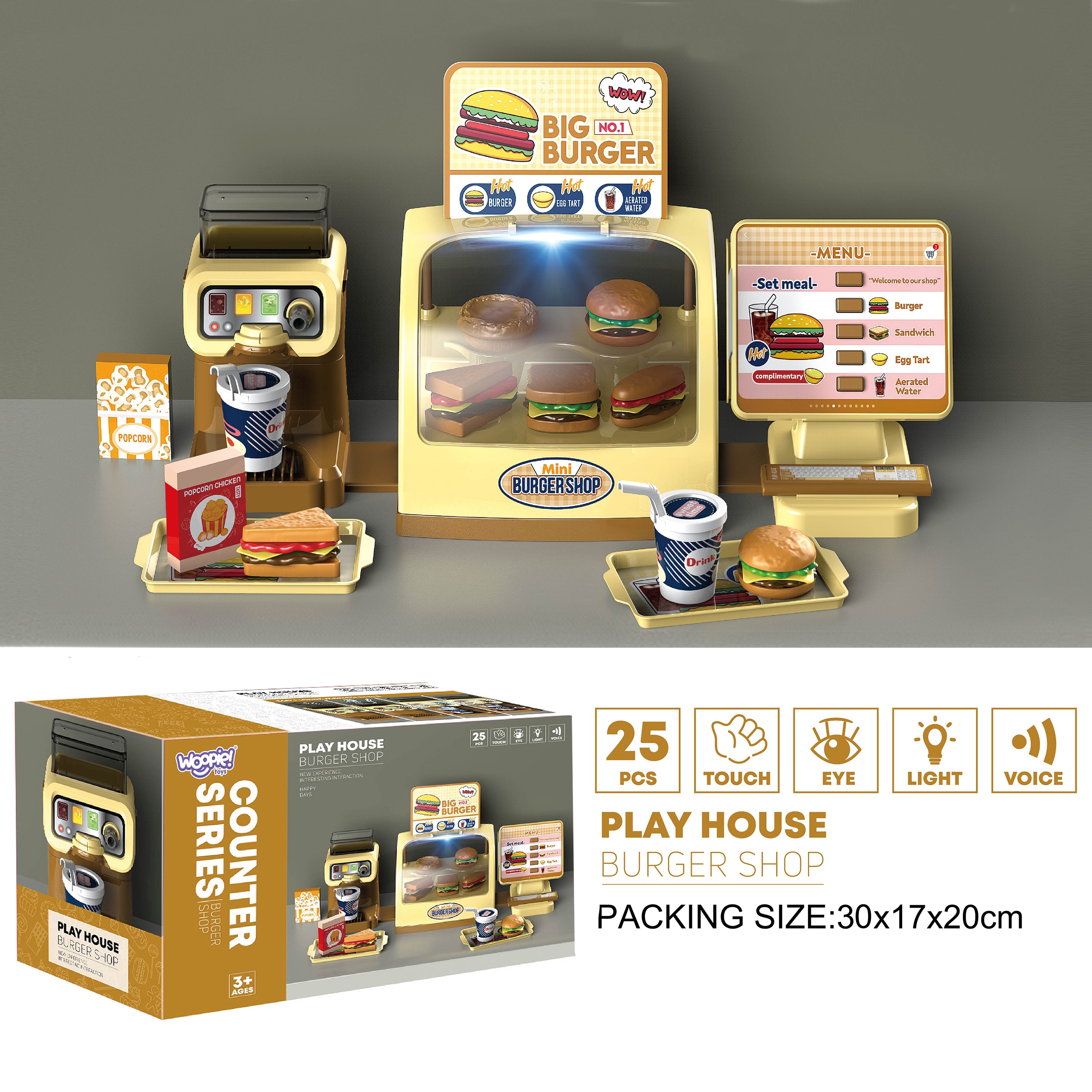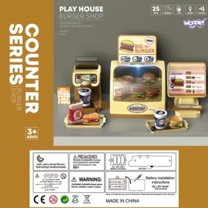 Mini Burger Shop “BIG BURGER” kaubamärgilt WOOPIE on suurepärane mängukomplekt. Saame teenindada kliente, kes valivad nõud otse valgustatud letilt! Sellel on nuppudega ekraan, vajutades pakub pood meile heliefekte! Saame valada jaoturisse vett ja valada selle kõrrega spetsiaalselt disainitud topsidesse. Komplekt arendab käelisi oskusi, kujutlusvõimet, loovust ja iseseisvat mõtlemist. Omadused: – komplekt lastele alates 3. eluaastast – on 25 elemendiga – peale ekraanil oleva nupu vajutamist mängib komplekt pildilt toote nimetust inglise keeles – komplektis on joogiautomaat, kuhu saab vett valada – komplekt vajab patareisid: 2 x 1,5V “AAA” (ei kuulu komplekti) – valgustusega lett. Komplekti kuuluvad: – hamburgerid – võileivad – friikartulid – 2 popkorni – kõrrega tassid – kandikud roogade serveerimiseks – ekraan – joogiautomaat – mündid ja maksekaardid