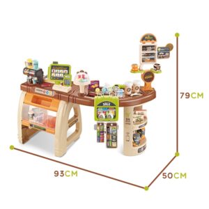 Woopie Supermarketi kauplus on ideaalne koht ostlemiseks teie lapsele ja tema sõpradele! Stendil on igale ostjale kõik vajalik olemas. Sellest supermarketist saate osta peaaegu kõike (65 tarvikut), sealhulgas: maiustusi, kohvi ja muid arvukaid toiduaineid. Müüja saab liigutada dosaatori käepidet ja valada jooki, serveerida varjualuse alt komme, serveerida toidukaupu läbi avaneva läbipaistva ukse ning näidata tellimust ekraanil tänu 360 kraadi pöörlevale ekraanile. Laps võib poes märgata kaasaegseid lahendusi: tähistatud moodsate tehnoloogiate sümbolitega (Wi-Fi). Supermarketis on palju riiuleid ja kohti erinevate maiuspaladega. Ostu sooritamisel läheb vaja münte, paberraha ja maksekaarti ning kassa ise tekitab skaneerimisel ja kaardiga maksmisel heliefekte ning on helendavate efektidega (vilkuv kassaaparaat). Ostke nagu päris! Omadused: – komplekt: supermarket + käru, – õppimine läbi mängu – mängiv müüja julgustab lapsi omandama põhilisi matemaatilisi ja finantsoskusi, – arendab kujutlusvõimet ja hoolitseb sotsiaalse arengu eest, – vastupidavast materjalist elemendid, – mänguasi, mis sobib igaks elujuhtumiks, – teisaldatavad elemendid – toidukauba kaas, kommide kaas, kraad, heliaparaat, kassaaparaat 360 efekti toodete skaneerimisel teeb häält skanner, häält teevad kassaaparaadi fiskaalil olevad nupud, kaardiga makstes teeb häält terminalist, – valgusefektid – vilgub kassaaparaat, – alus on tähistatud kaasaegsete tehnoloogiate sümbolitega (Wi-Fi), – vajalik: 3 AA patareid (ei kuulu komplekti). Komplekti kuulub: – letiga supermarket, – kassa/ekraan terminaliga, – tooteskanner, – 65 poetarvikut, sealhulgas: – kohv, – rull, – mahl, – jogurt, – piim, – küpsised, – maksekaart, – mündid. Woopie kaubamärgi mänguasjadel on üks eesmärk – teha lastele rõõmu! Rikkalikust sortimendist leiab Woopie muuhulgas karnevalikostüüme ja kostüüme lastele, aga ka rippkiikesid, vahtplastist mänguasju, erinevat tüüpi aiamänguasju ja palju muud! Laske end lõbusalt kaasa haarata – laske end Woopil kaasa haarata!