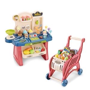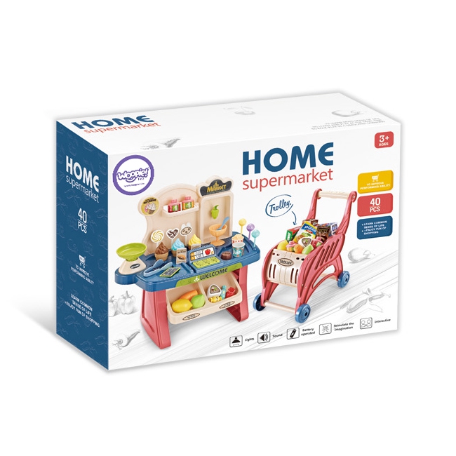 Supermarket WOOPIE ostukärukaalu kassaskanneriga ja 48 tarvikuga.