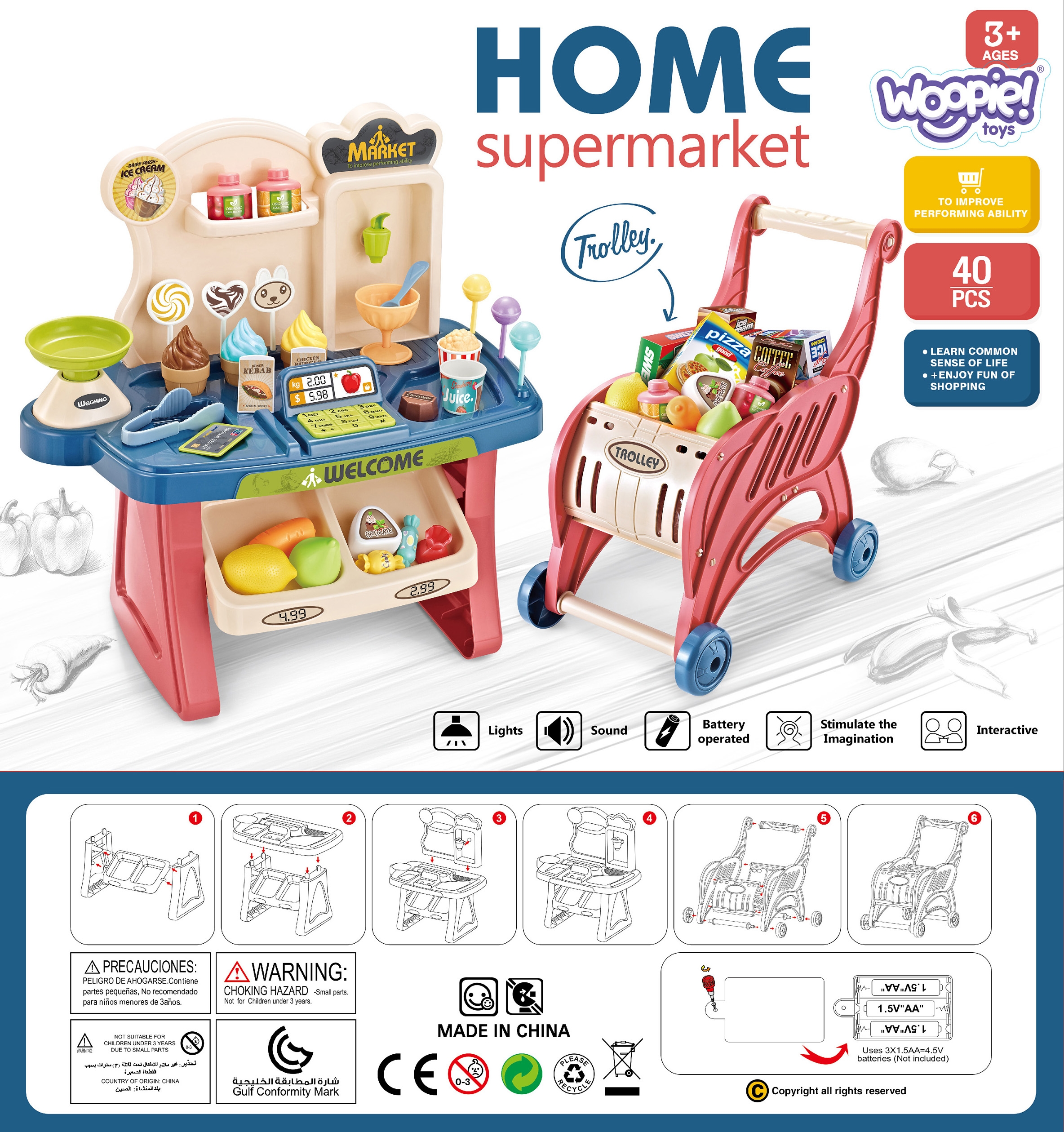 Ostukäruga supermarket on ideaalne komplekt teie noorimatele lastele. Pood on varustatud muusika ja välguga, mis kindlasti köidavad lapse tähelepanu ja julgustavad teda mängima. Supermarketi detailne esitus muudab toote väga realistlikuks, mistõttu on see ideaalne kingituseks. Mänguasi sobib suurepäraselt iseseisvaks mängimiseks ja sõpradega kohtumiseks. Lapsed saavad vaheldumisi täita kaupluse müüja ja kliendi rolli. Kui libistate krediitkaarti, vilgub märgutuli korra ja supermarketi kassast kostub “di” heli, mis tähendab, et kaart töötab korralikult. Klaviatuuri klahvi vajutamisel vilgub märgutuli korra ja supermarketi kassast kostab “deng” heli, mis tähendab, et makse on õnnestunud. Tunnused: – omab heli- ja valgusefekte, – õppimine läbi mängu – mängiv müügimees julgustab lapsi omandama esmaseid matemaatilisi ja finantsoskusi, – arendab kujutlusvõimet ja tagab sotsiaalse arengu, – toode on lastele ohutu, – vastupidavatest materjalidest elemendid. Komplekti kuulub: – Kaupluse kassaaparaat – Ostukorv – Maksekaardilugeja – 40 poe tarvikut, sealhulgas: – Kaalud – Jäätis – Pulgakommid – Puuviljad – Köögiviljad – Maiustused Mänguasi arendab: – Kujutlusvõimet ja loovust – Sotsiaalseid oskusi – Kognitiivseid oskusi – Peenmotoorikat – Kõne arendamine – Et lapsed saaksid õnnelikuks Woopie brändi mänguasjad! Rikkalikust sortimendist leiab Woopie muuhulgas karnevalikostüüme ja kostüüme lastele, aga ka rippkiikesid, vahtplastist mänguasju, erinevat tüüpi aiamänguasju ja palju muud! Laske end lõbusalt kaasa haarata – laske end Woopil kaasa haarata!