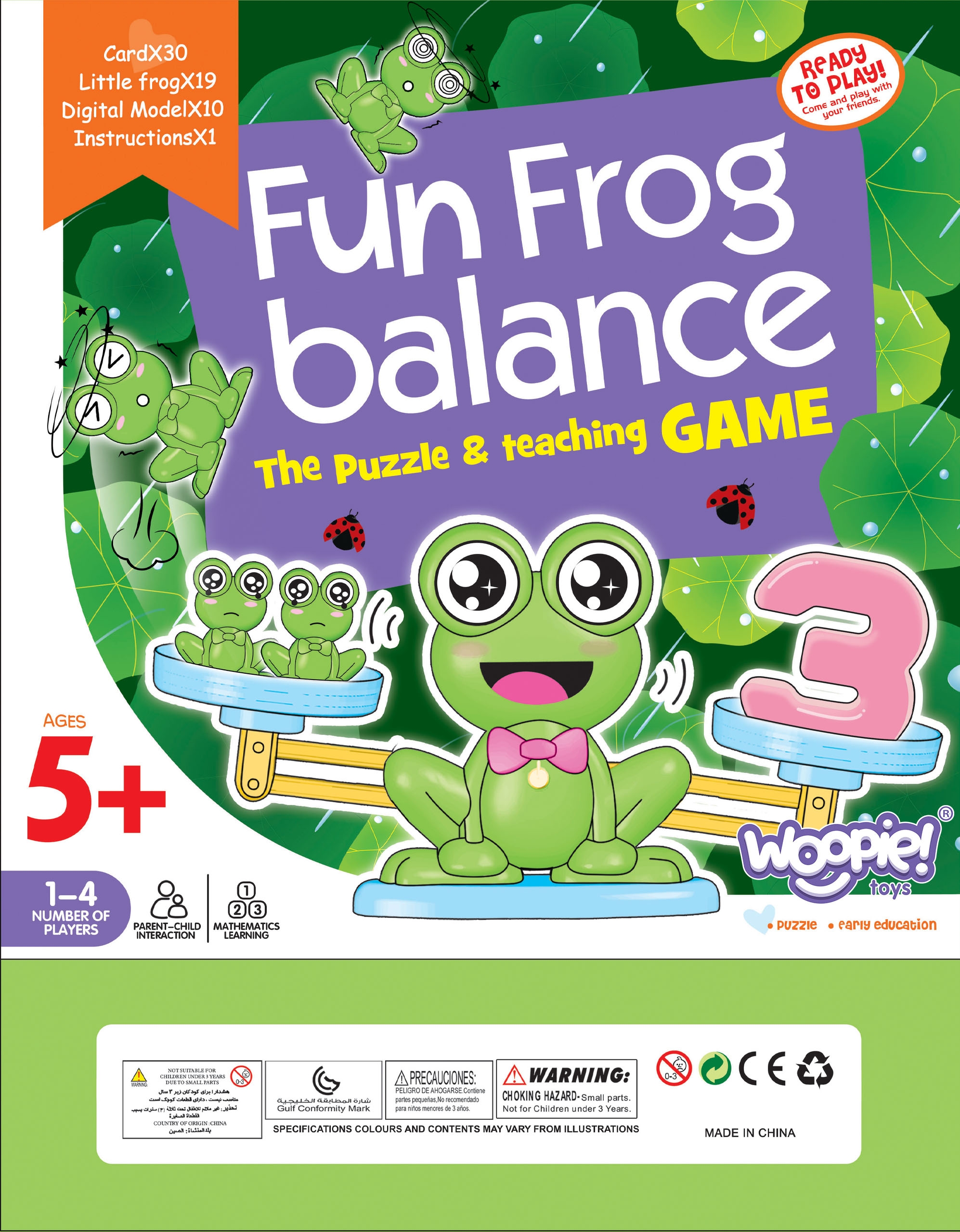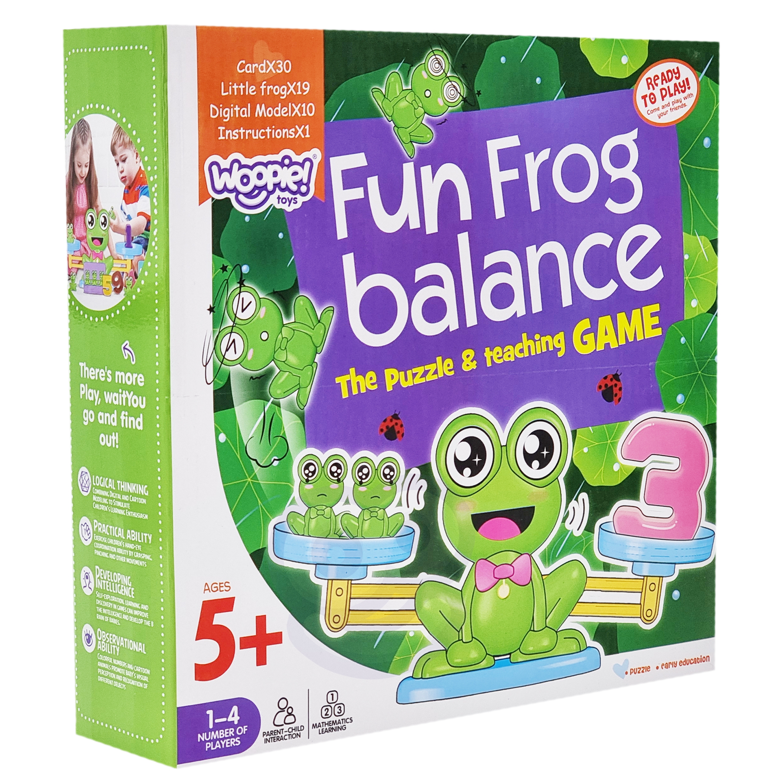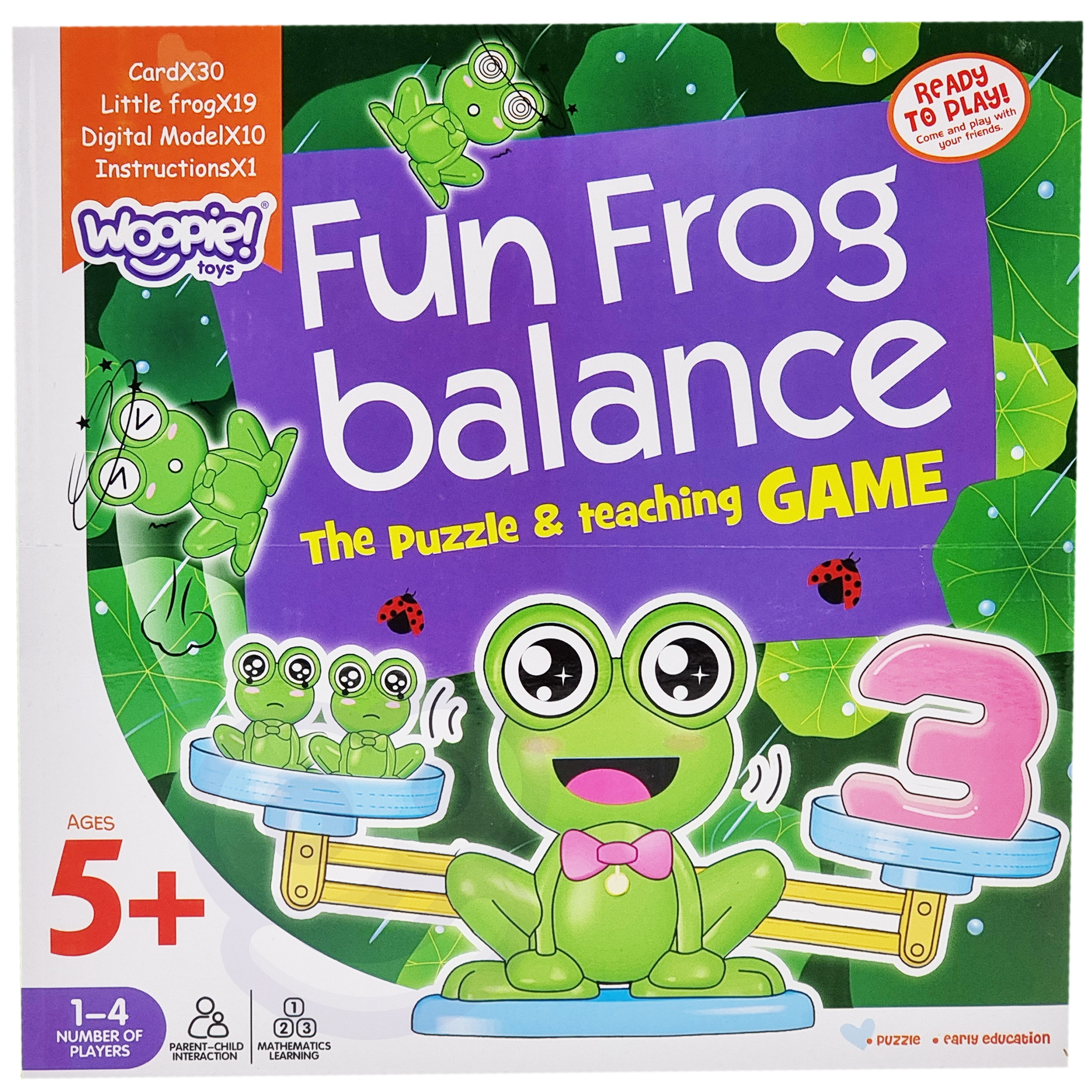 WOOPIE kaubamärgi Frog Balance Scale arendab teie lapse kognitiivseid oskusi. Asetage number ühele skaala küljele ja vastav arv konni teisele poole. Kui tulemus on õige, on kausid loodis. Komplekti kuuluvad ka kaardid erinevate matemaatiliste näidetega. Saate ise oma lapsele matemaatilisi tegevusi välja mõelda ja tema lõbusust mitmekesistada. Kaal on suurepärane ettekääne lapsega koos mängimiseks, mille käigus laps õpib koostööd ja tõhusat suhtlemist. Mänguasi muudab matemaatika õppimise tõeliseks naudinguks ja julgustab teie last edasi õppima. Mänguasi arendab kognitiivseid oskusi, sealhulgas suurust, käelisi oskusi ja ergutab kujutlusvõimet, julgustades loovat ja ebatavalist mõtlemist. Tunnused: – mänguasi vanuses 5 ja vanemad, – kaardid erinevate matemaatiliste näidetega, – interaktiivne lõbu, – nt. number “5” kaalub sama palju kui 5 konna, – õppimine läbi mängu, – julgustab matemaatikat õppima, – laps seostab numbri suurust ja järjestust suurema kaaluga. Mänguasi arendab: – kognitiivseid oskusi, – käelisi oskusi, – loovust ja kujutlusvõimet. Komplekti kuuluvad: – 19x konnad, – 10x numbrid, – 30x kaardid matemaatiliste tehtega.