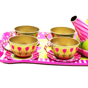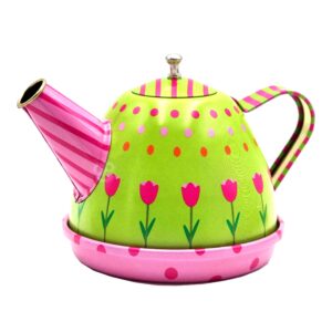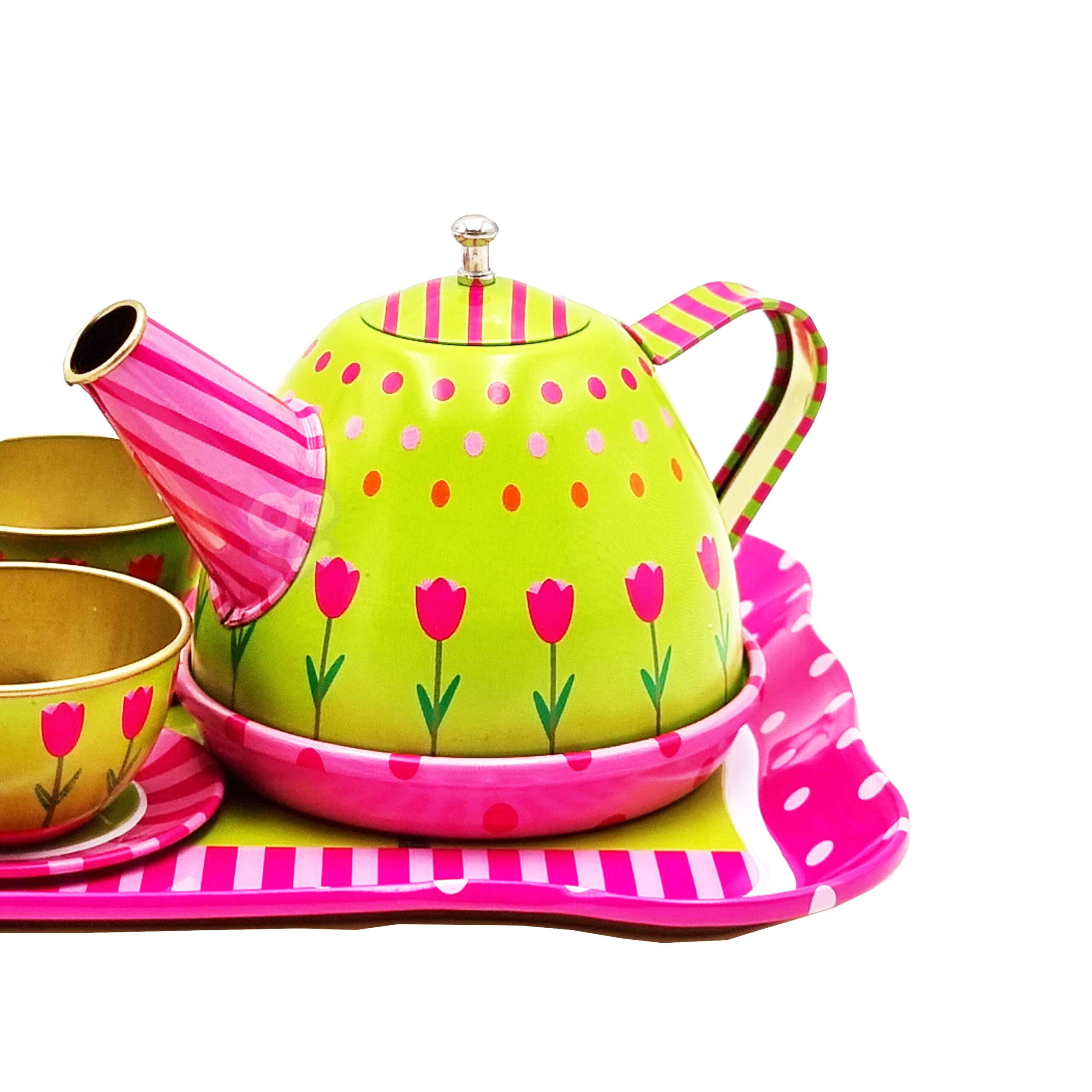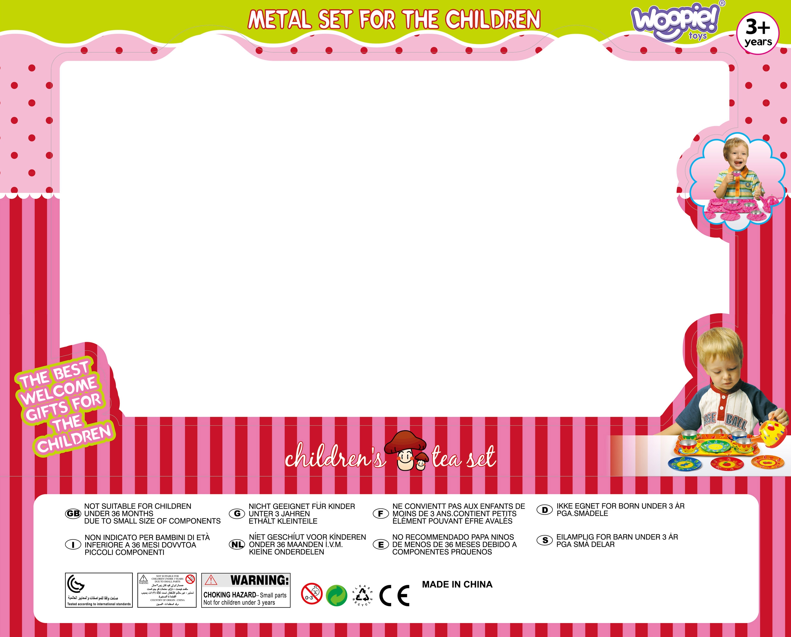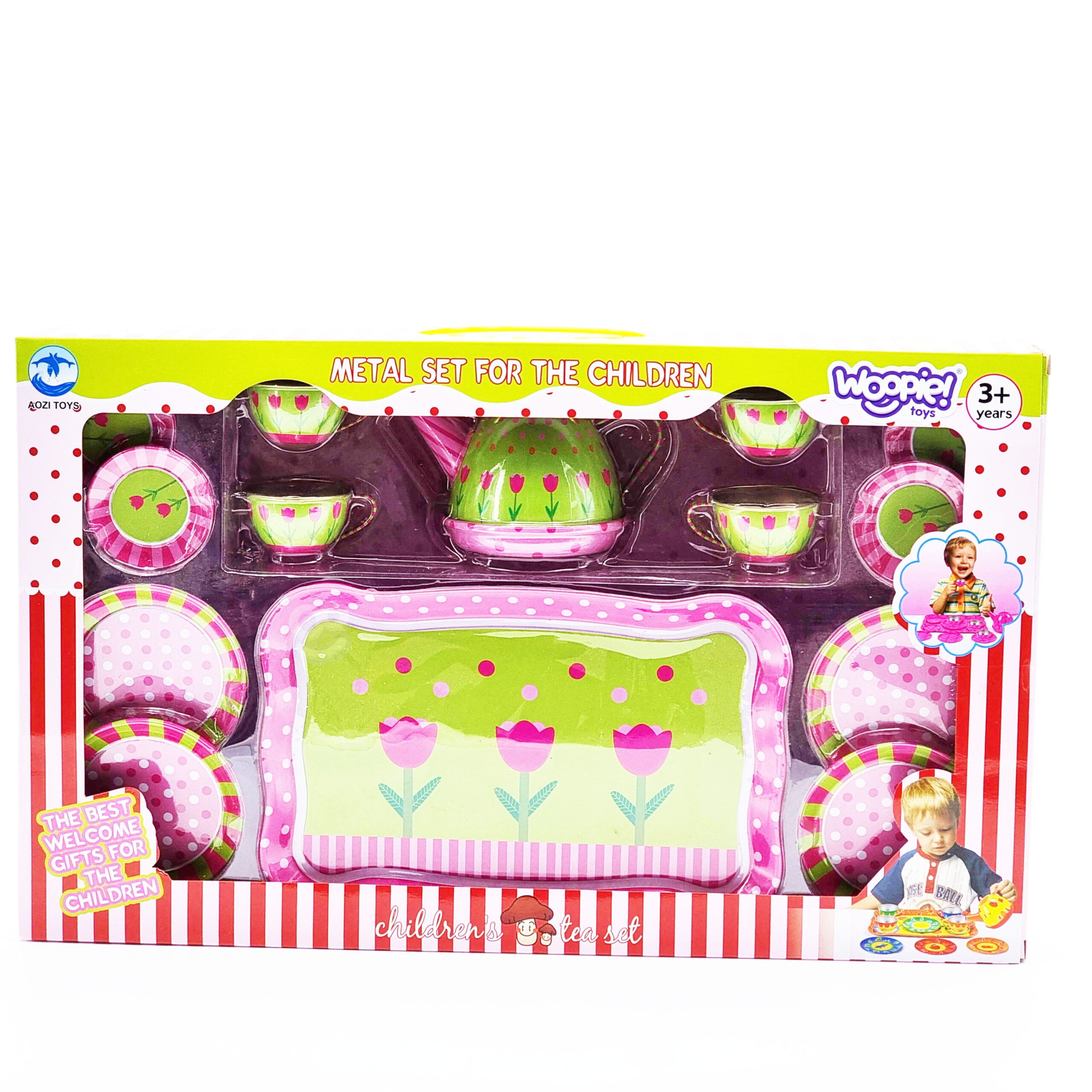 Woopie teekomplekt on see, mida teie pisike vajab. Komplekt on valmistatud metallist, mis tagab, et see ei saaks ka kukkumisel nii kiiresti vigastada. Karbis on kann, tassid, taldrikud ja taldrikud ning suur kandik maalitud lilledega. Komplekt on mõeldud lastele alates 3. eluaastast. Omadused: – alates 3. eluaastast, – komplektis on 14 elementi, – vaoshoitud värvid, – iga element on lille- või täpimustriga, – kogu komplekt on metallist, – puuduvad teravad servad. Komplekti kuulub: – suur kandik, – taldrikud tasside jaoks, – tassid, – kann, – suured taldrikud,