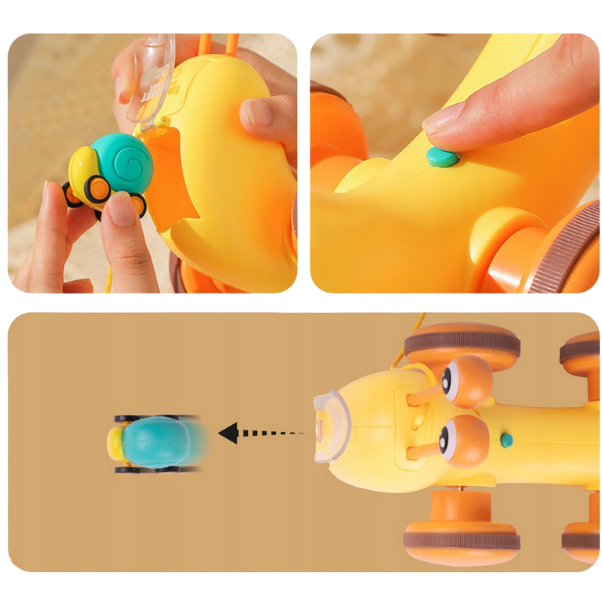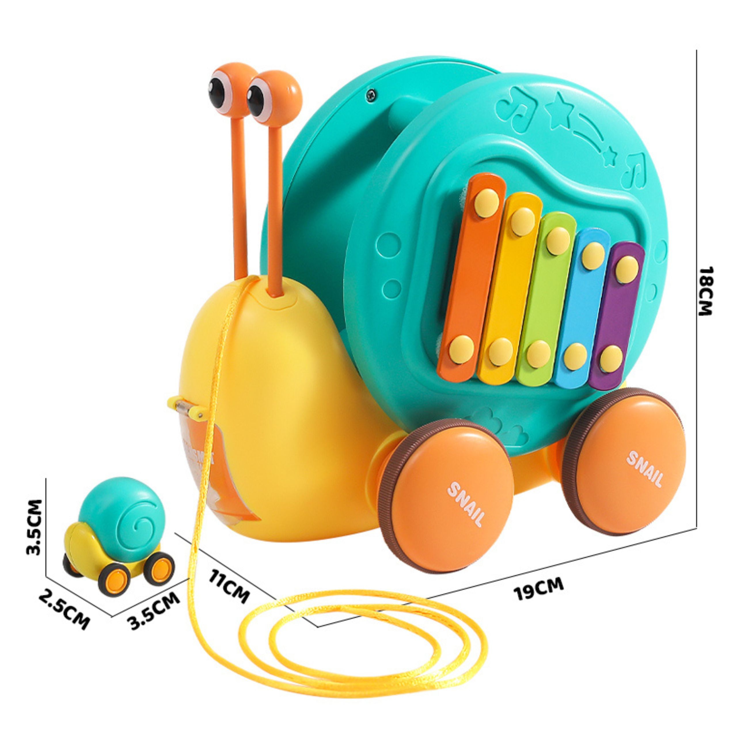 Multifunktsionaalne tigude lükkamise mänguasi kaubamärgilt WOOPIE, mis köidab laste tähelepanu ja ergutab nende kujutlusvõimet. Erksad värvid parandavad ka nende visuaalset taju ja esteetilist taju. Tigu tõmbamise mänguasi pakub erinevaid võimalusi mängimiseks ja õppimiseks. Klahve saab vajutada, et treenida laste kuulmist ja käe-silma koordinatsiooni. Tegu saab ka rihma otsa tõmmata või lükata ja lasta mööda põrandat libiseda, mis lisab lõbusust ja väljakutset. Lapsed õpivad mängides tundma loomi, muusikat ja põhjus-tagajärg seoseid. Julgustage jälgimist, loogilist mõtlemist ja füüsilist koordinatsiooni, kuna teie laps naudib tundide kaupa loomingulist mängu. Tigutõmbemänguasi on suurepärane võimalus oma lastega õnnelikku aega jagada. Emmed saavad oma pisikestega mängida ja vaadata, kuidas nad tigu liigutades itsitavad. See mänguasi sobib perekondlikuks suhtluseks ja võib suurendada vastastikusi tundeid. Mänguasi koosneb kahest osast: teokarp – mis sisaldab taldrikuid, ja silmade kujulised pulgad (asetatakse kesta sisse). Teine osa on teo kerest tehtud kanderakett väikesele autole – mänguasja tagaküljel on nupp, mis avab autole kanderaketi. Omadused: – Lastele alates 18. elukuust – Teo kõrgus on 18 cm – Sellel on nupp, mis tulistab väikest tigu – Eemaldatavad silmad, tänu millele saate klahve koputada – Vastupidav nöör, mille abil saate mänguasja tõmmata – Teo tõmbamisel pöörleb kest vastupidises suunas, luues laheda visuaalse efekti. – Vastupidav kõrgelt kukkumisele – Teo silmade jaoks on võimalik avada karbi aukudega – Karbile paigaldatud taldrikud Komplekti kuulub: – Teo kujuline mänguasi – Taldrikud, mida saab mängida tänu teosilmade eemaldamise lihtsamale funktsioonile – Nöör Mänguasi arendab loogilisi oskusi – mõtlemisvõimet – Sensoorset – Avastamist